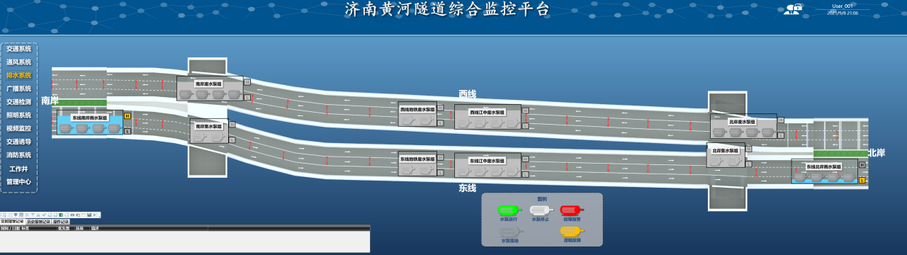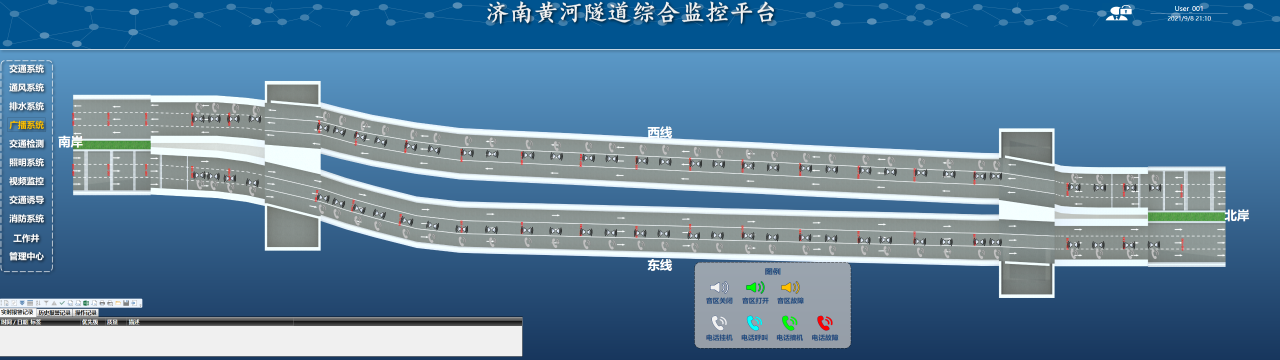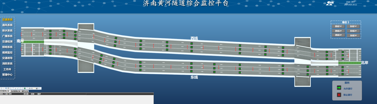 在济南黄河济泺路隧道中,交通系统的主要设备包括72个道路指示灯、7块情报板和12组车感线圈,设备的应用可以有效地诱导车辆按照规定的路线和速度行驶,保证交通流畅和安全,进一步提高交通运营效率;