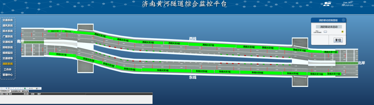 隧道消防系统拥有147套泡沫喷雾、136个双波长火焰探测器、87个消火栓箱、288个灭火器箱、2条感温光纤和6台功率110kw风量36万m³/h排烟风机,设备的应用可以在火灾初期及时发现并处理火灾,保障隧道内人员和设施的安全;