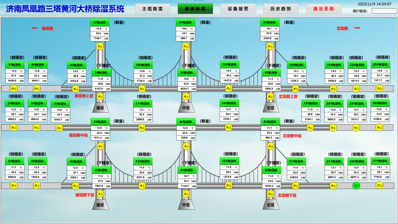 为保持桥梁结构强度,防止钢箱梁、内部钢架、主缆锈蚀,延长桥梁使用寿命,大桥安装有3套主缆除湿系统、6套鞍室除湿系统、6套主塔除湿系统、27套钢箱梁除湿机。所有除湿机都使用网格连接,顺利获得逻辑控制系统实现数据共享、自动化除湿等任务,时刻消除设备顽疾病害,提高行车安全系数。
