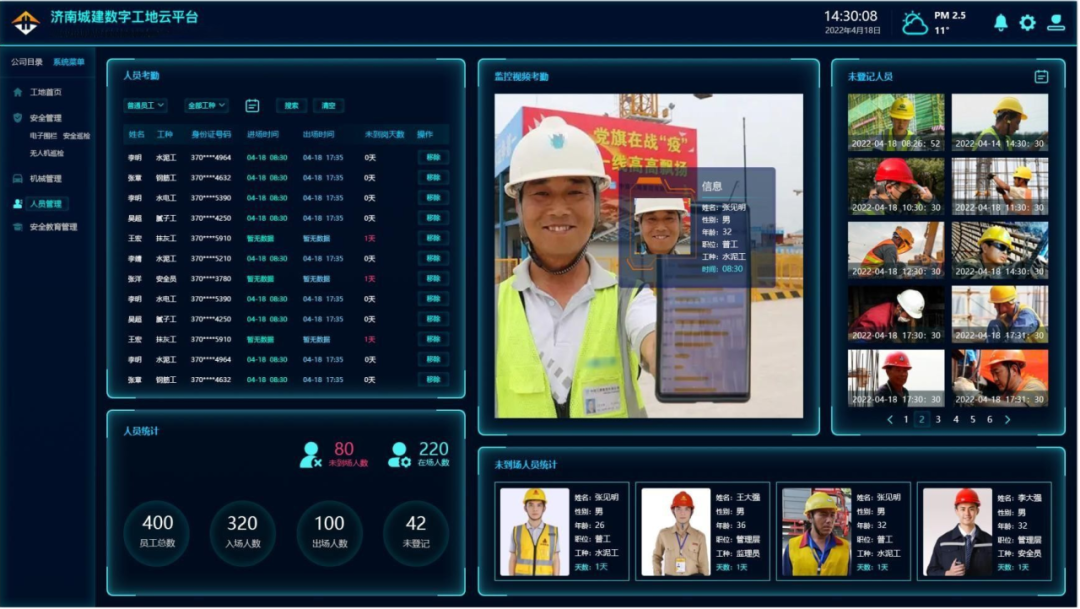 人员管理实现优化,G104京岚线济南黄河公路大桥扩建工程项目应用智能化劳务人员管理系统,系统根据视频采样,可以实时定位,统计当日出勤人数,能够针对不系安全带、不正确佩戴安全防护用品,违章动火作业等进行智能识别,并抓拍报警。系统累计保障工地安全620天,累计录入工人800余人,摄像头安装17个,避免了火灾,机械违规载人,安全用品佩戴不规范,防护缺失等隐患发生。