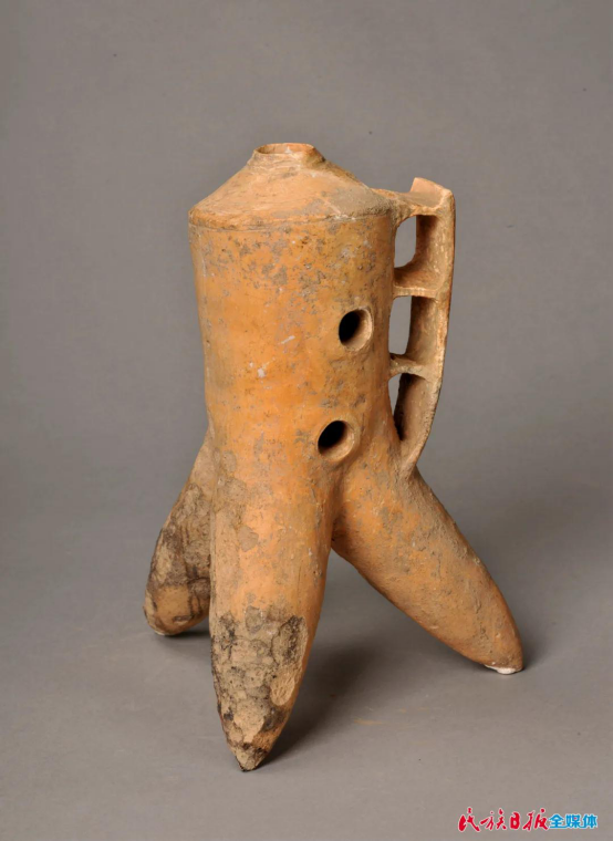 除了玉器,这里还展出了齐家文化最具代表性的器物——陶器。其中一件叫三足盉,是齐家陶器的代表性器物。这件展品问世后,因结构巧妙、制作精良、年代久远且保存非常完整,引起了国际上的关注,取得世界各国专家学者的一致好评。
