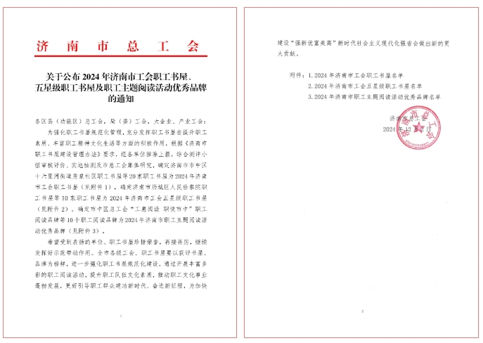 近期,市总工会公布了《关于公布2024 年济南市工会职工书屋、五星级职工书屋及职工主题阅读活动优秀品牌的通知》,济南城市OG真人官方有限公司职工书屋获评济南市工会五星级职工书屋。