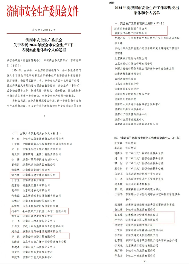 近期,济南市安全生产委员会印发《关于表扬2024年度全市安全生产工作表现突出集体和个人的通报》,济南城市OG真人官方及集团所属山东金曰交通开展集团被评为安全生产工作表现突出集体,3名同志被评为安全生产工作表现突出个人,2名同志被评为“审计式”监督检查服务工作表现突出个人。