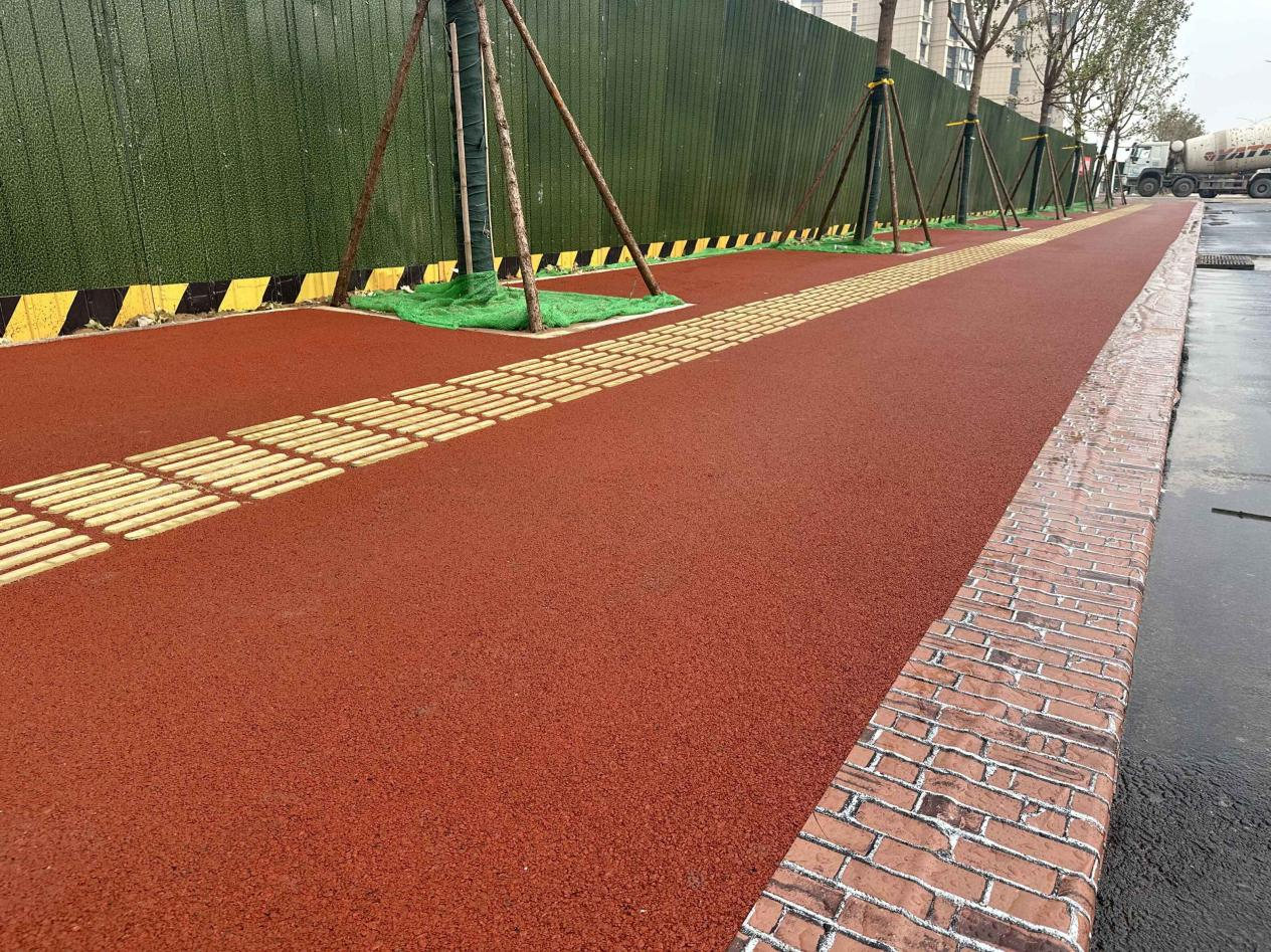 济南新旧动能转换起步区总部经济四期工程安置五区项目持续响应创新提效号召,在人行道使用聚氨酯彩色沥青,收效良好。聚氨酯彩色沥青分子链中含有氨酯基或异氰酸酯基类的胶粘剂,其与沥青材料顺利获得物理粘接形成强度不同的混合物。聚氨酯胶粘剂具备化学反应活性,与碎石混合后可以吸收空气中的水分或外加水以及与碎石表面结合水发生化学反应,形成强度极高的化学粘接,从而极大提高混凝土的力学强度。项目人员精心筹备,严格按照规范施工,铺筑路面表面平顺一致,整体效果美观大方。