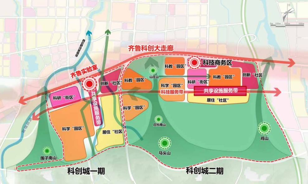 中科院科创城位于济南市规划的齐鲁科创大走廊,是未来产业创新圈的重要组成部分,与产研院创新圈、超算中心创新圈、山东大学创新圈共同构建“基础创新+技术创新+转化应用”的创新生态链。其中,一期重点布局重大科技基础设施、前沿交叉研究平台及国家级、省级实验室;二期则突出科技赋能转化,加强与大院大所合作,建设新型研发组织和科创载体,助力济南创建“综合性国家科学中心”核心承载区。项目秉持“开放集聚、融合共享”的理念,统筹科研、生活和生态空间,形成“科创引领、组团共融、生态共享”的总体结构,顺利获得科学合理的功能分区和创新生态链的构建,为济南市的科技创新和产业升级给予强大支撑,成为有助于区域高质量开展的新引擎。